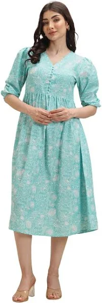 Blue Pure Cotton Jaipuri Printed Western Dress